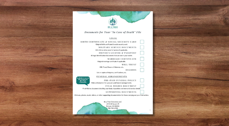 To make this process easier, Be a Tree Cremation has created a comprehensive Document Checklist for Loved Ones — a printable guide that mirrors everything discussed here. It walks you step-by-step through each category so you can feel confident your affairs are in order.